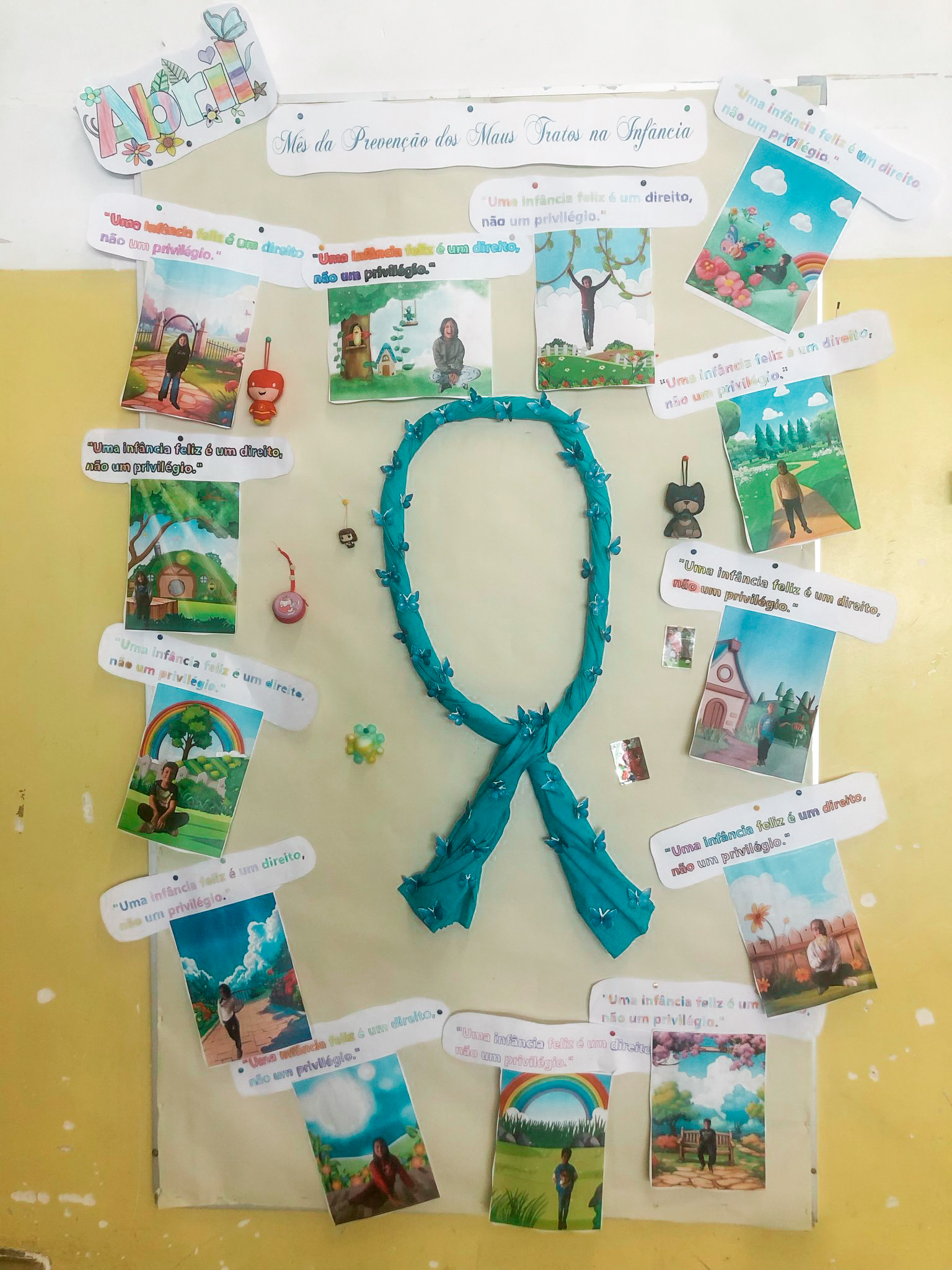 Cada aluno selecionou um “fundo mágico” retirado da internet, onde posteriormente foram integradas fotografias individuais capturadas pela professora. A montagem final culminou num trabalho visualmente apelativo, tendo ao centro o símbolo da campanha: um Laço Azul. Para enriquecer a mensagem, cada aluno contribuiu com um brinquedo de casa, reforçando a importância do brincar e da alegria na infância.