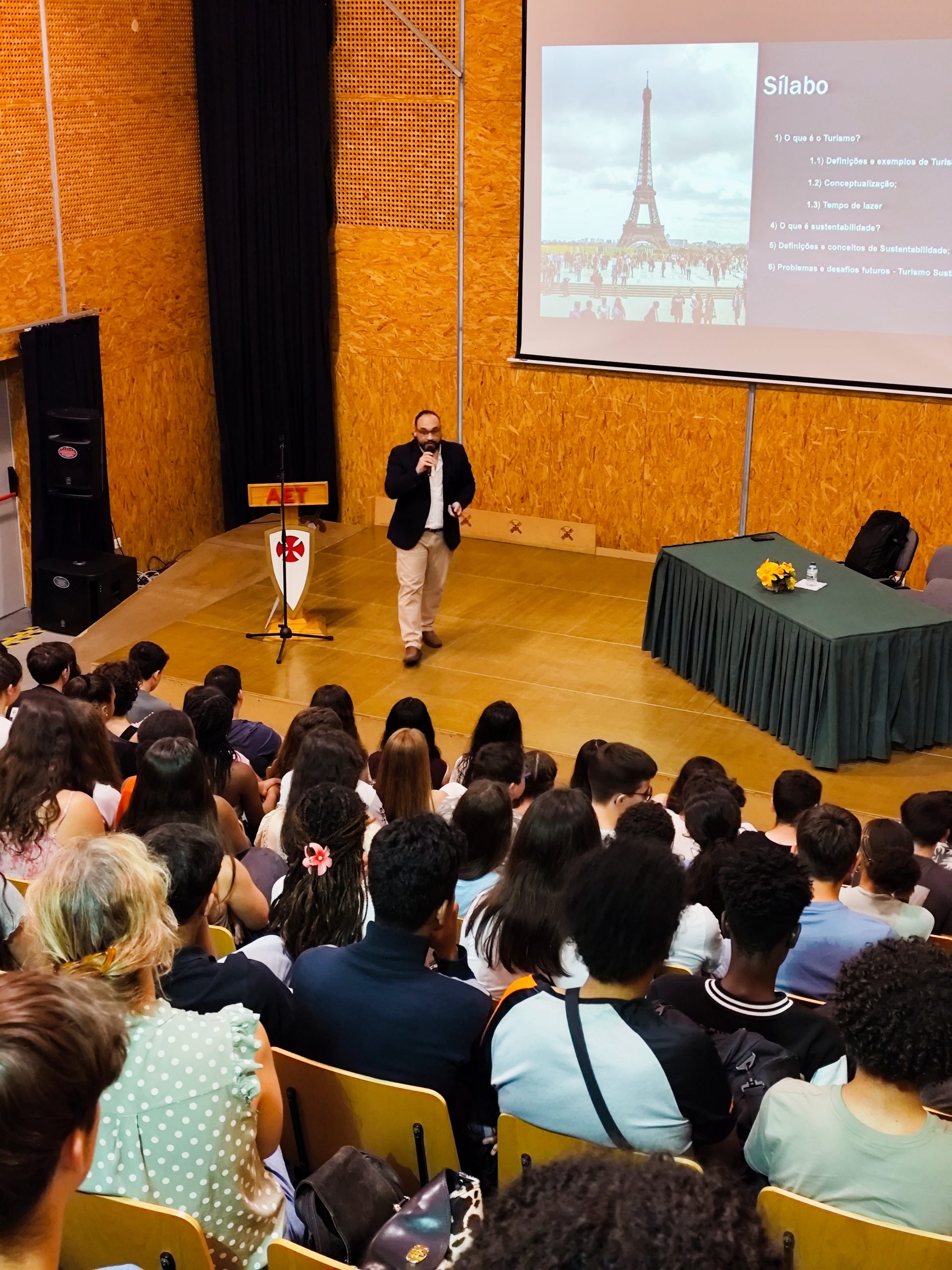 Na manhã do dia 30 de maio, o Auditório da Escola Jácome Ratton encheu-se de alunos de 7.º, 8.º e 9.º anos e de professores para assistirem à Palestra sobre “Turismo Sustentável”, proferida pelo Dr. João Tomaz Simões, do IPT.