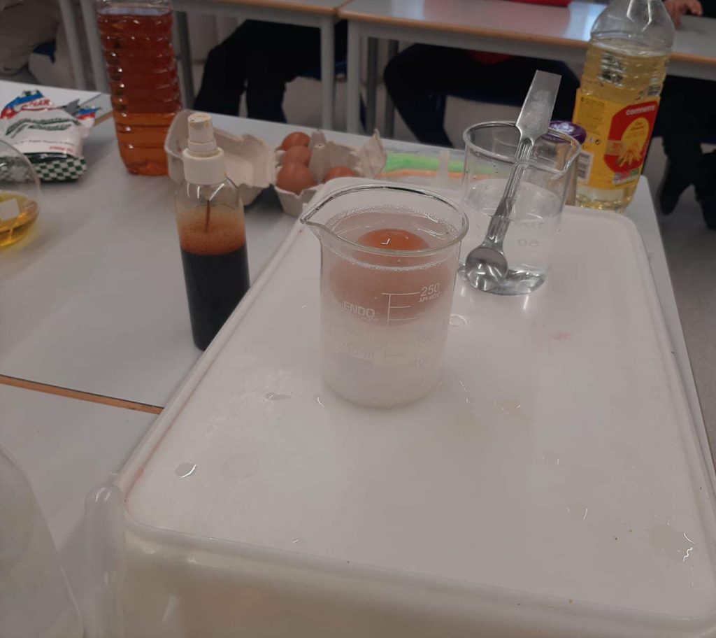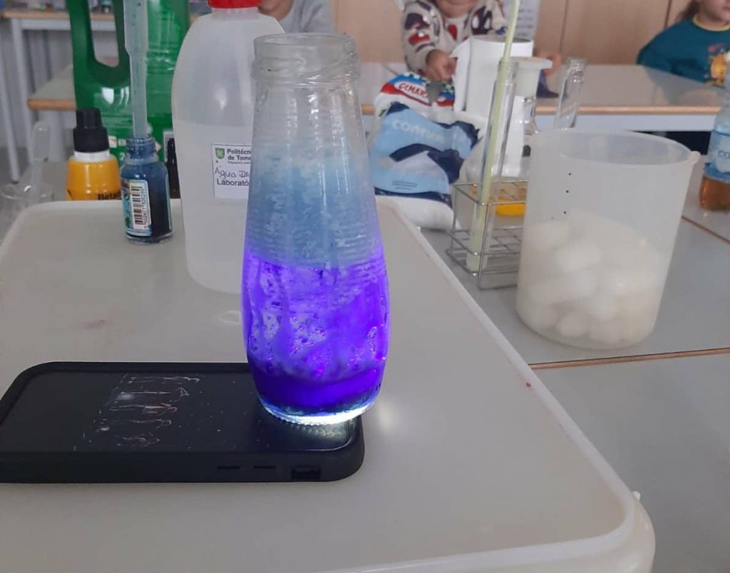 A atividade teve como objetivo aproximar os alunos da ciência através de experiências práticas que demonstram a presença da Química no quotidiano. Entre as demonstrações realizadas destacaram-se o candeeiro de lava, a escrita invisível e o vulcão de lava, o ovo que flutua e a garrafa que enche o balão, experiências que despertaram curiosidade e promoveram aprendizagens significativas.