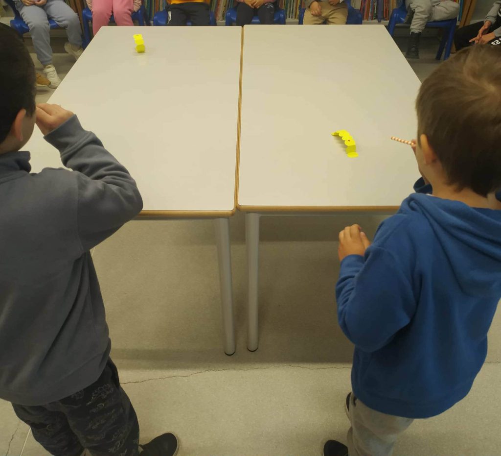 Os alunos do pré-escolar também participaram na celebração, explorando situações relacionadas com o ar, como a divertida corrida das lagartinhas, onde comprovaram a “existência do ar”. Esta demonstração, que proporcionou momentos de descoberta e entusiasmo, foi dinamizada no âmbito da Biblioteca Escolar, pela educadora Conceição Pádua, reforçando a importância da articulação entre ciência e literacia.