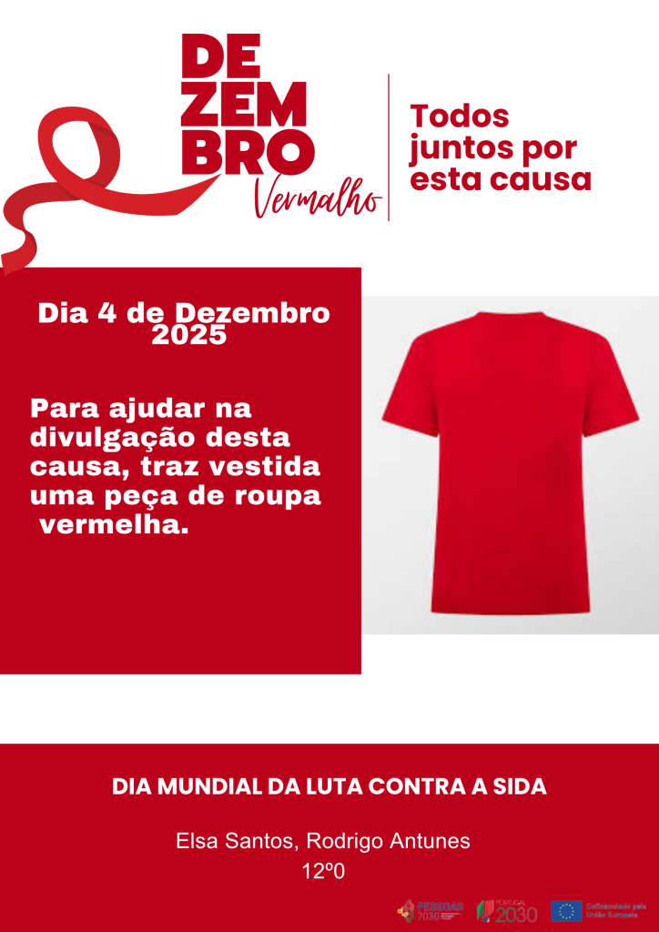 Os alunos Elsa Santos Mota e Rodrigo Antunes, do 12ºO do Curso Profissional Técnico/a Auxiliar de Saúde, convidam toda a comunidade escolar a vestir, no dia 4 de dezembro, uma peça de roupa vermelha, de forma a alertar as pessoas para a necessidade de prevenção e de precaução contra o vírus da SIDA.