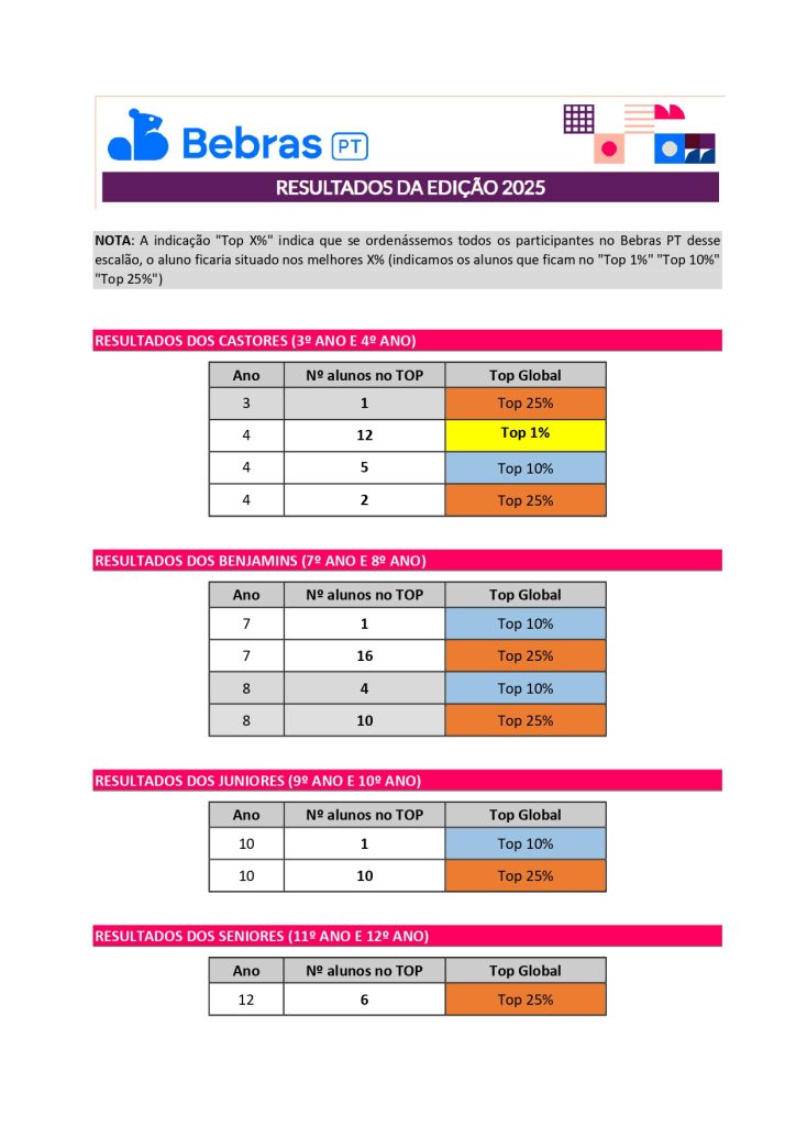 Muitos alunos conseguiram resultados que permitiram alcançar o TOP 1%, o TOP 10% e o TOP 25%, a nível nacional.