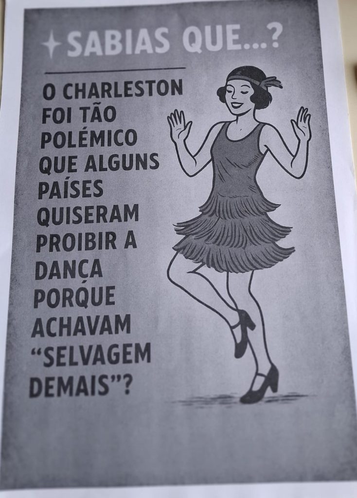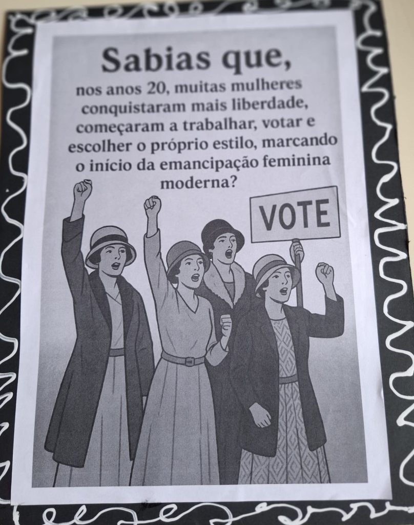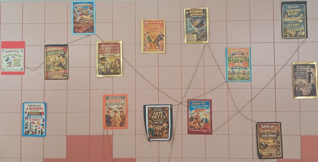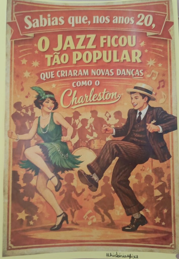 Ao longo da última semana, os corredores da escola encheram-se de cores, criatividade e história, com cartazes alusivos à década de 1920 — um período marcado por grandes transformações culturais, sociais e artísticas. Cada turma do 9.º ano contribuiu para a exposição com trabalhos originais que destacaram aspetos como a moda, a música jazz, o cinema, a arte déco e as mudanças de comportamento da sociedade da época.