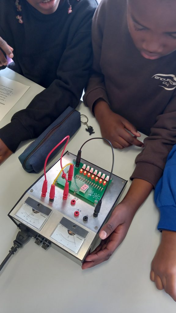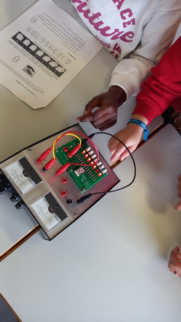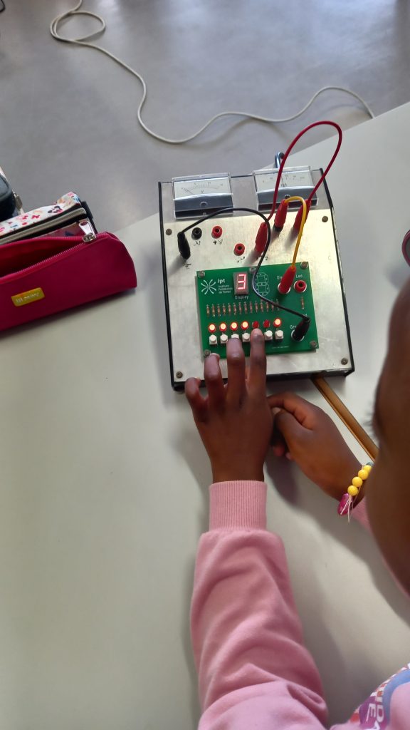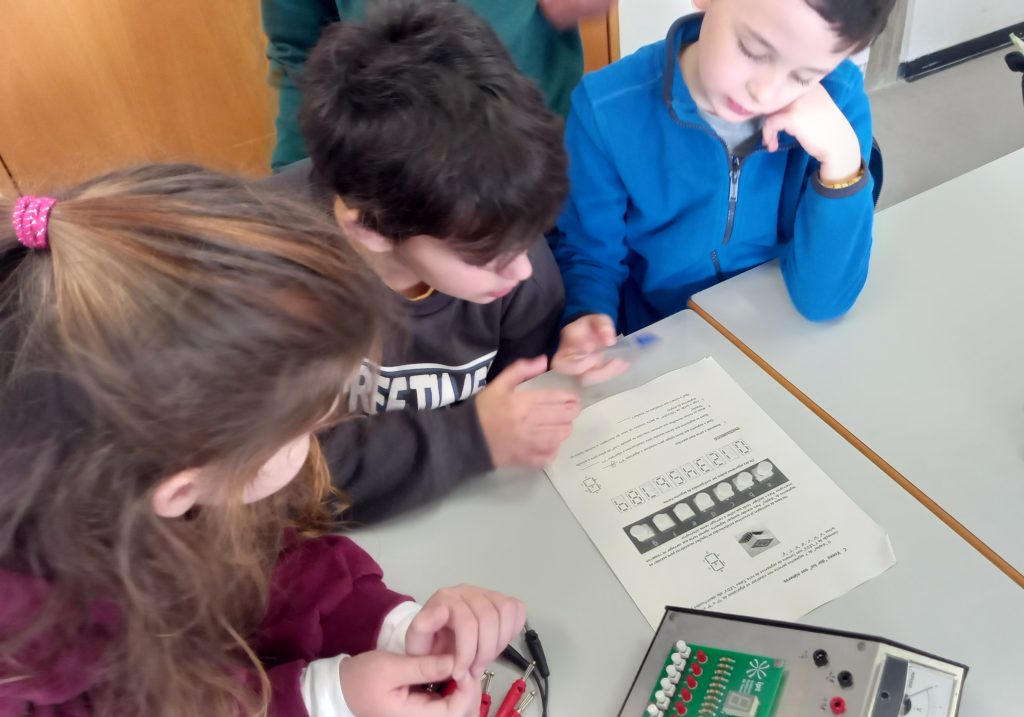 Durante a atividade, os alunos tiveram a oportunidade de contactar com ligações elétricas simples e compreender como funciona um circuito elétrico. Utilizando aparelhos e fios, construíram circuitos que permitiram acender luzes formando diferentes números. Quando o circuito estava completo, a corrente elétrica passava pelos fios e as luzes acendiam.