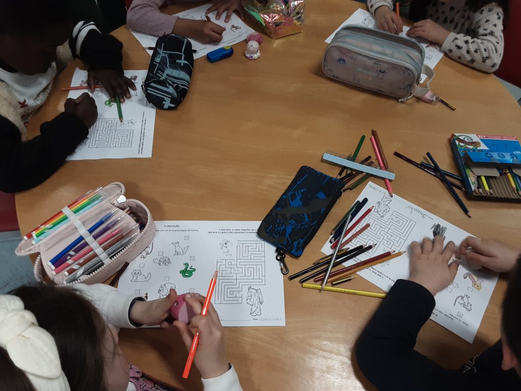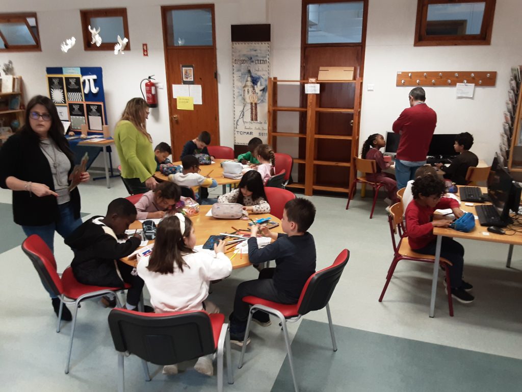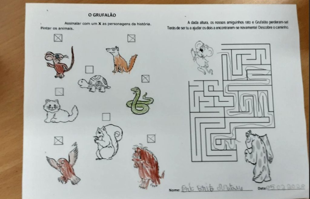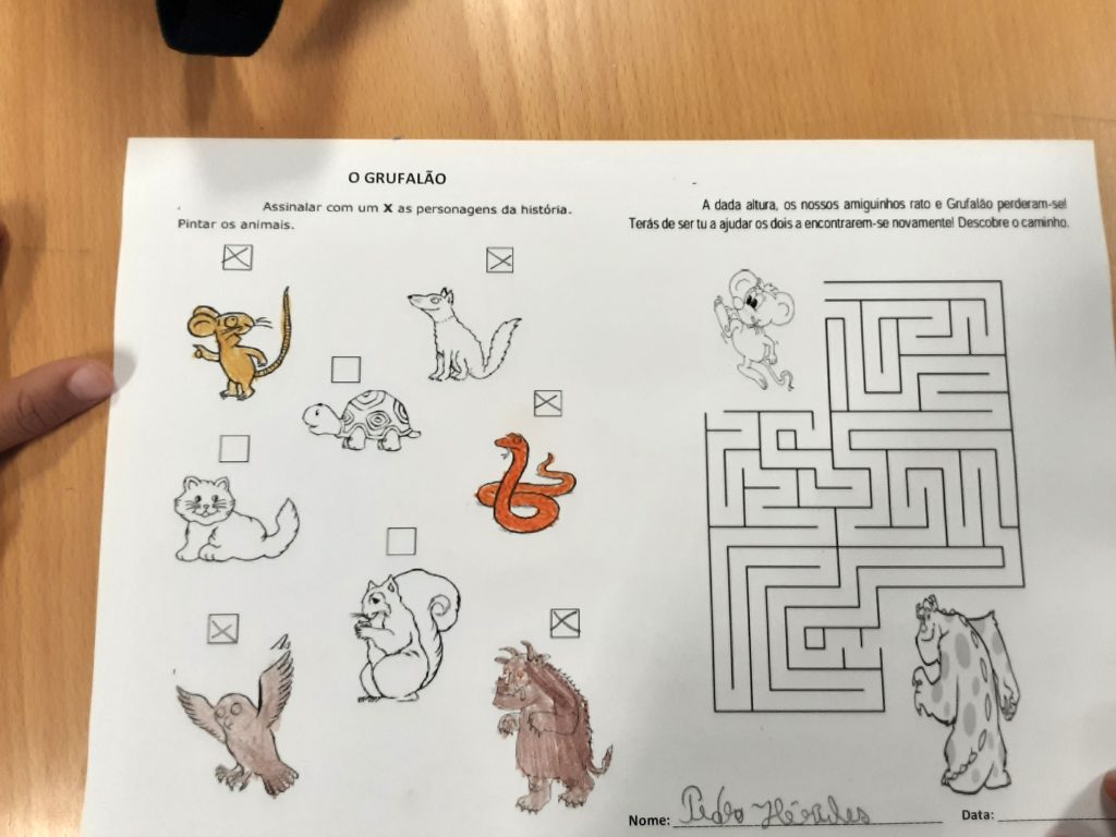 A atividade iniciou-se com a leitura em voz alta da obra e respetiva exploração de conteúdos, realizadas pela professora Sónia Coelho, seguindo-se a realização de uma ficha sobre as personagens da história.