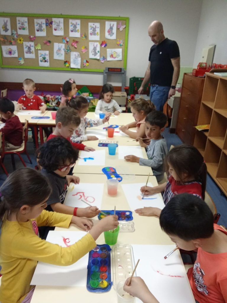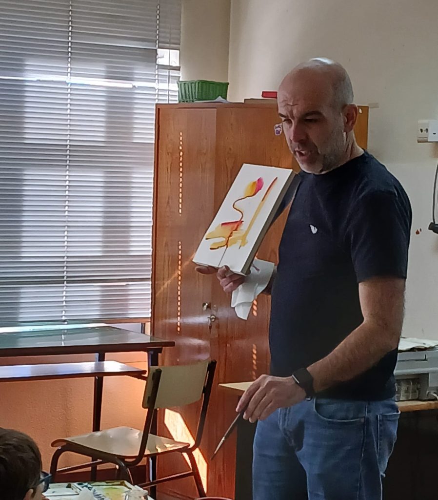 Durante a sessão, explicou aos alunos como pintar com aguarelas em folhas molhadas com água.