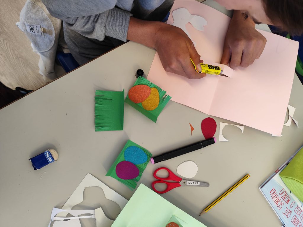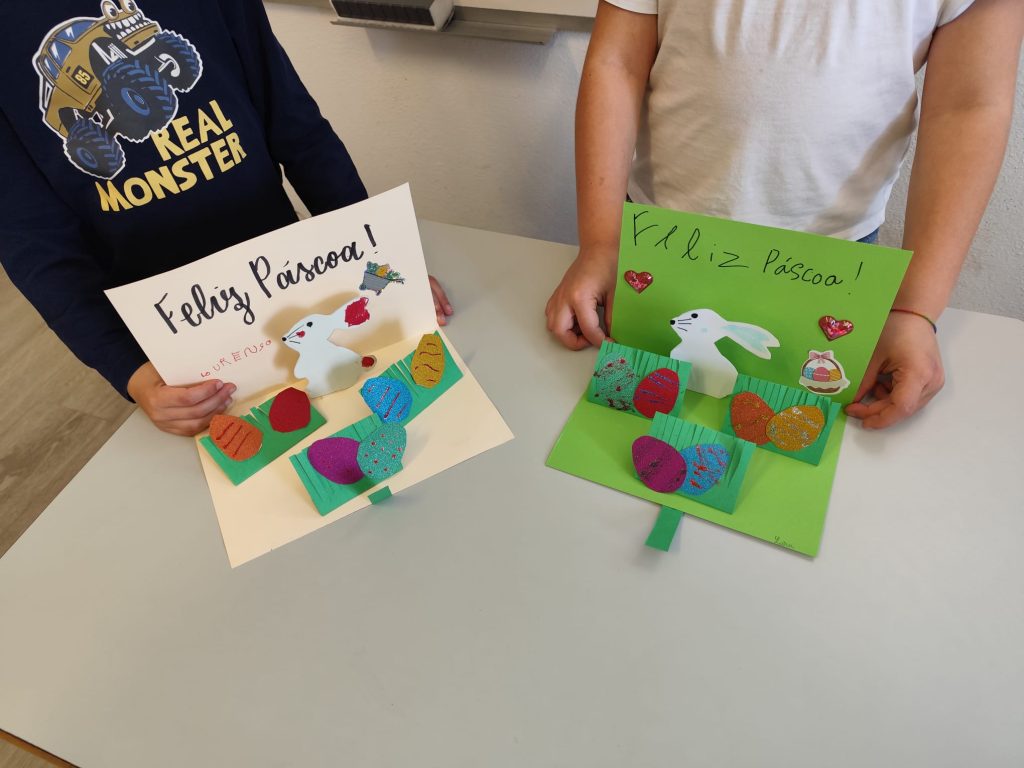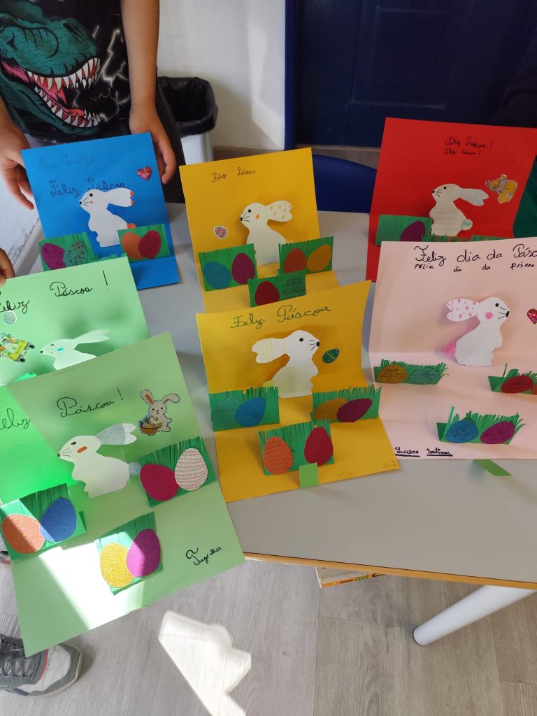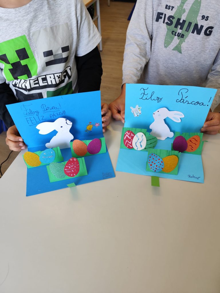 As crianças participaram num workshop de criação de cartões de Páscoa, dinamizado pela aluna Lara Gomes Maia (9.º ano), num ambiente lúdico e colaborativo. A atividade estimulou a criatividade, a expressão artística e a motricidade fina, valorizando tradições culturais e promovendo a sustentabilidade através do uso de materiais reciclados.