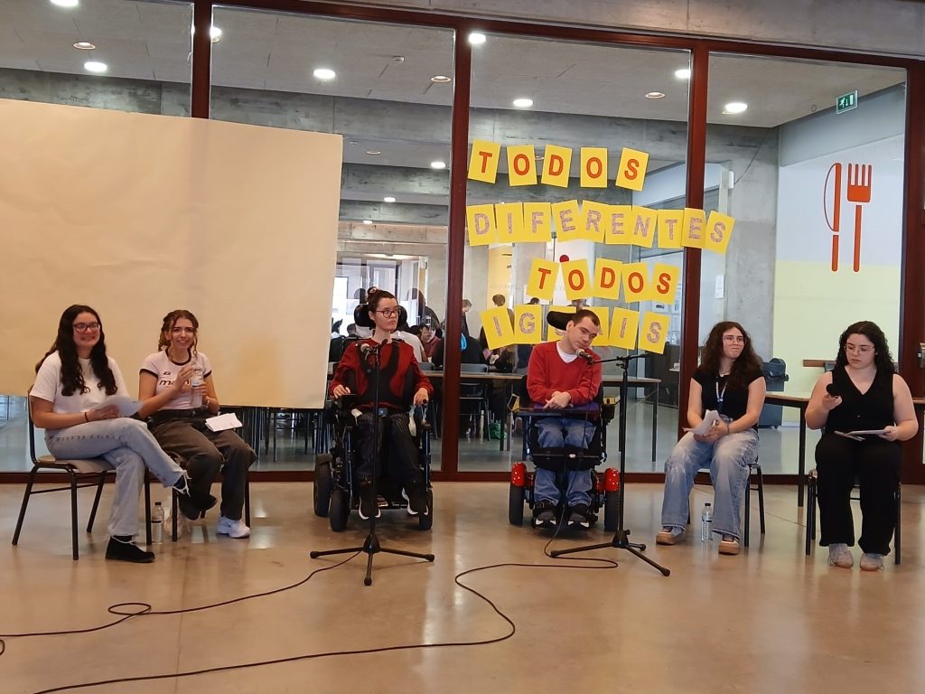 Na quinta-feira, dia 2 de abril, pelo período da manhã, a turma moderou o debate “Todos diferentes, todos iguais”, dando a palavra aos quatro convidados que partilharam a sua história de vida e a forma como lidam com a sua deficiência. No intervalo das conversas, surgiu ainda o momento “Rodas Dançantes” que animou os espectadores do debate.