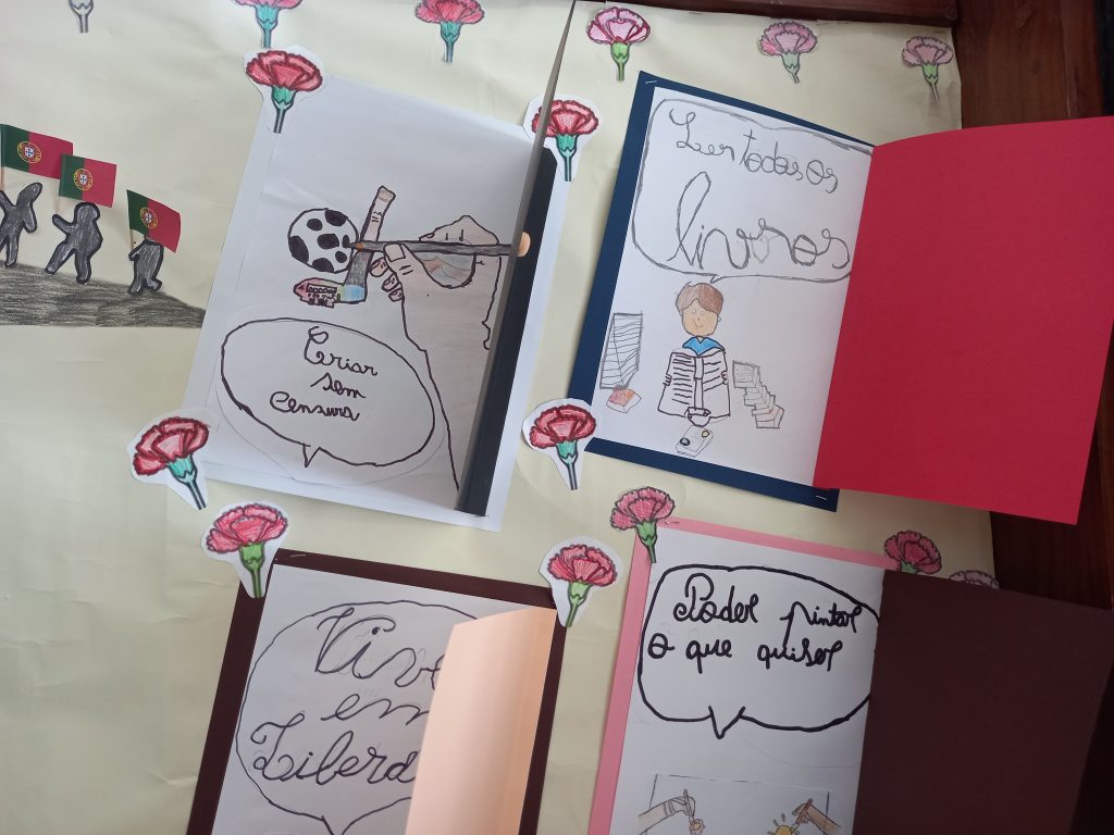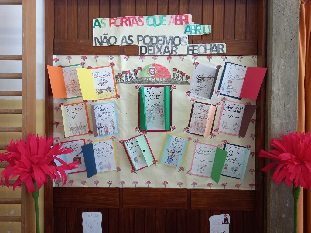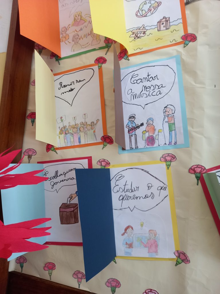 Após um profundo trabalho de reflexão sobre as conquistas democráticas em Portugal, os alunos “mergulharam” na história para compreender como se vivia antes da Revolução e o que mudou com a chegada da democracia. O resultado é um painel vibrante e cheio de significado, no qual cada aluno ficou responsável por ilustrar uma frase representativa das vitórias que a “Madrugada de Abril” nos trouxe. Entre cravos vermelhos e desenhos carregados de cor, retrataram-se as liberdades e os direitos conquistados com a Revolução dos Cravos.