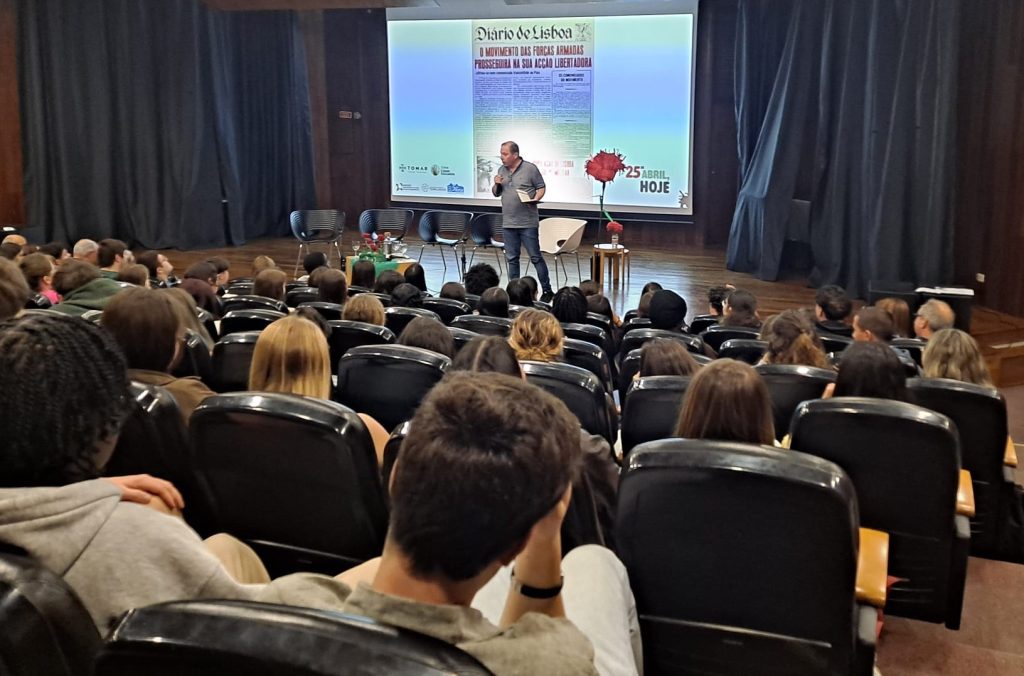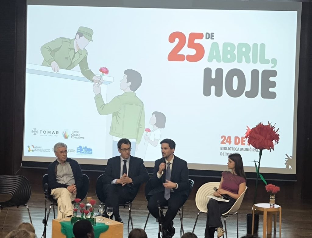 No passado dia 24 de abril, a Biblioteca Municipal António Cartaxo da Fonseca, em Tomar, acolheu um debate dedicado ao 25 de abril, promovido pelo Município de Tomar, em parceria com a Escola Profissional de Tomar, o Agrupamento de Escolas Templários (AET), o Agrupamento de Escolas Nuno de Santa Maria (AENSM) e o Centro de Integração e de Reabilitação de Tomar (CIRE).